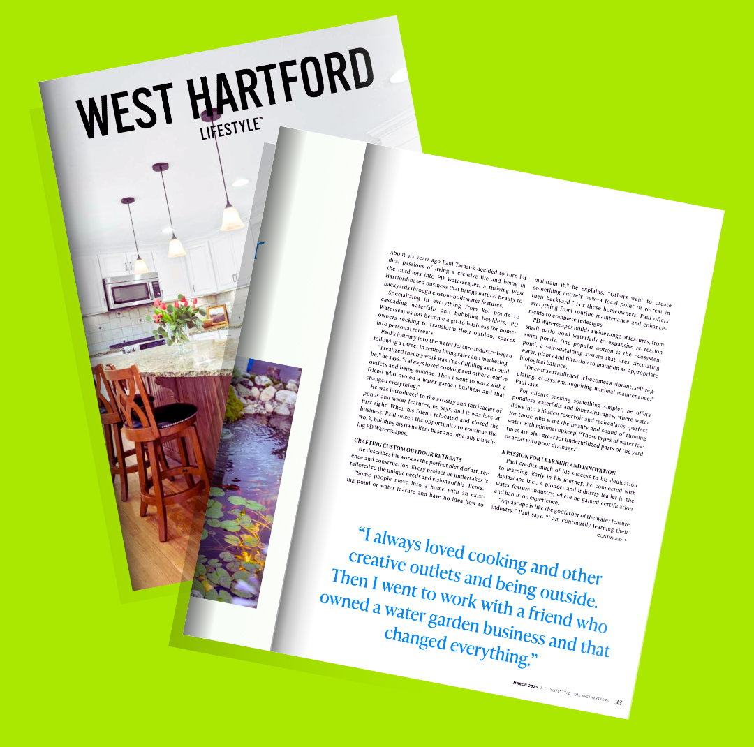 Proudly enhancing lives with ponds and water features in West Hartford, Hartford County, Litchfield County, and surrounding towns in Connecticut and Western Massachusetts.